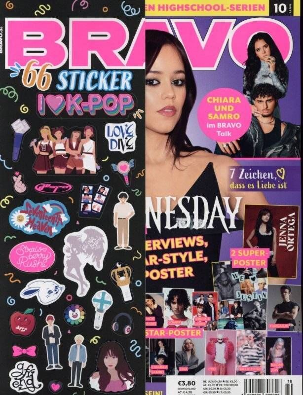Bravo Magazine issue 10 2025 Wednesday, Jenna Ortega, Emilia, Loris, Chiara, Samro, Finch, Gracie Abrams, Sombr, Yungblud, Billie Eilish, Naomi Jon, Justin Bieber Inside - Наверное, один из самых старых молодежных журналов Германии. На нем воспитывалось не одно поколение подростков со всего мира. Журнал издается во многих странах. Политика актуального подхода к поп музыке, часто эксклюзивные репортажи, фотосессии и плакаты, делают этот журнал интересным для разнообразного круга читателей.